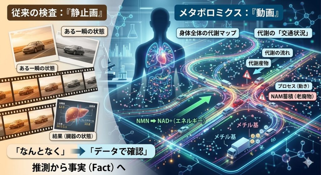 - 従来の血液検査は「静止画」であり、結果(臓器の状態)を見るもの。対してメタボロミクスは「動画」であり、プロセス(代謝の流れ)を見る技術である。