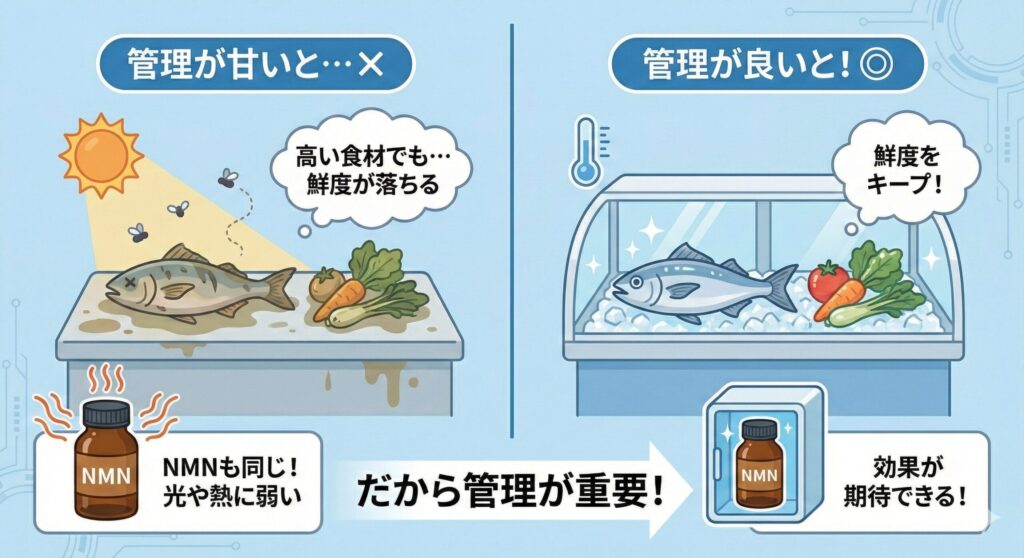 - NMN在化學上為單一成分,但製劑穩定性與管理狀態可能造成品質差異