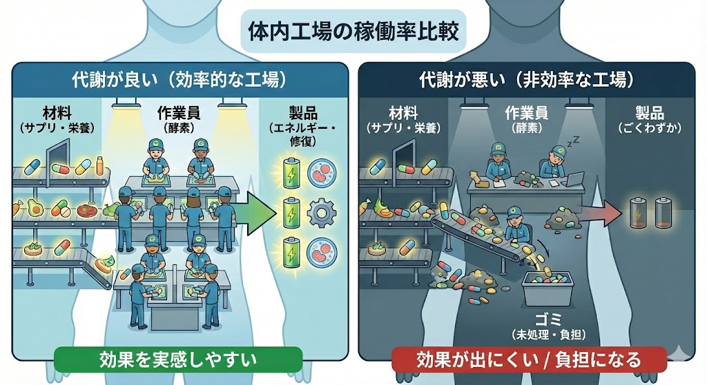 当原料(保健品等)进入时,更可能迅速被转化为“产品”(能量或修复相关物质)。=“较容易感受到变化的倾向” - 工人较少,或工人“效率不高”的工厂(代谢活性低)