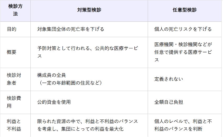 例如全身检查或者癌症筛查等为任意型检查,其目的是为了降低个人的死亡风险而实施的“非对策型筛查”。这种筛查没有检查方法和年龄的限制。